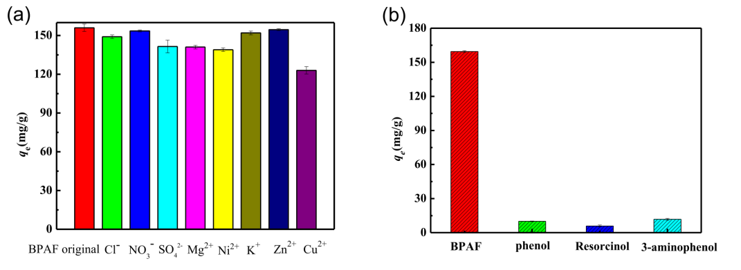 Figure 8.(a)各種共存離子對N-MIL@CNT吸附BPAF的影響。(b)N-MIL@CNT對四種酚類物質(zhì)吸附能力的比較。