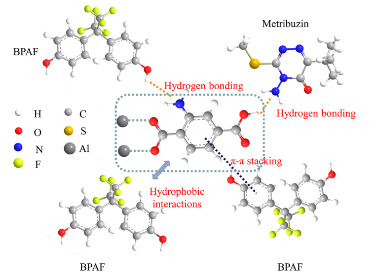 Figure 10. N-MIL@CNT對BPAF和嗪草酮的吸附機理示意圖。
