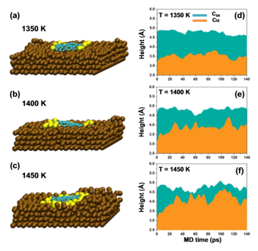 Fig. 5 在不同溫度下,半熔融Cu基板上的石墨烯納米帶(GNR)。