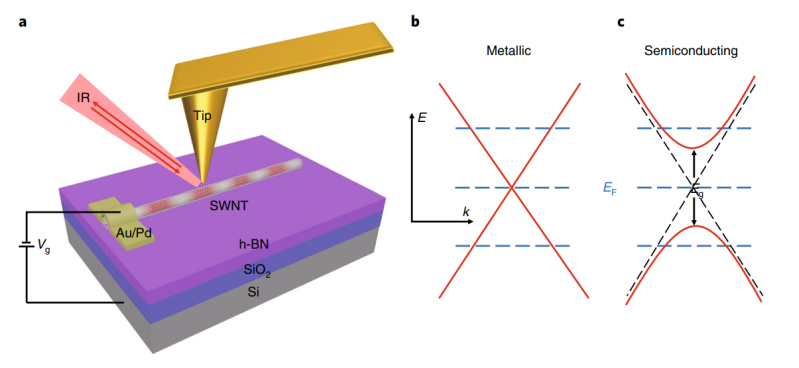 Figure 1. 隨著可電控的載流子濃度變化,SWNTs的IR-SNOM示意圖。(a)納米管FET裝置的紅外納米成像示意圖,(b)金屬SWNTs的能帶結(jié)構(gòu),(c)半導(dǎo)體SWNTs的能帶結(jié)構(gòu)。