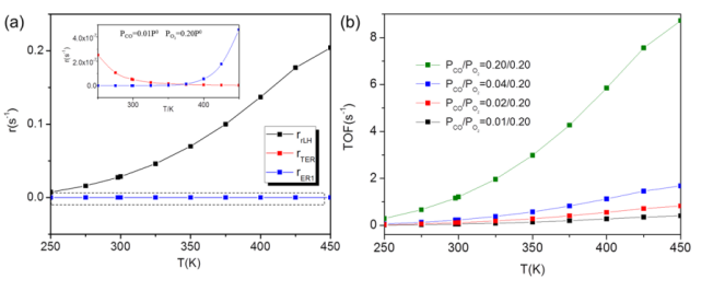 O2比例下,TOF隨溫度的變化情況。沿著TER和ER1途徑的反應(yīng)速率相似,圖(a)中的插圖是對應(yīng)的放大圖。