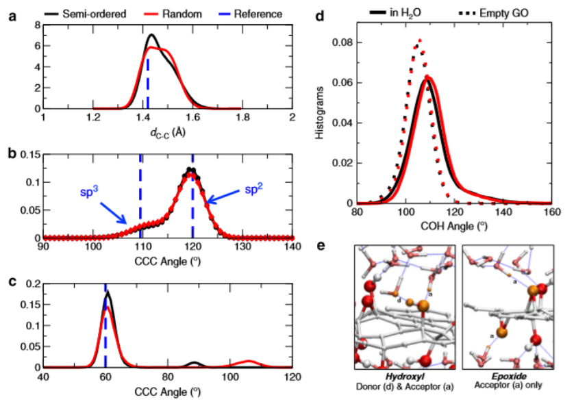 氧化石墨烯是2D材料中的后起之秀,但是它與液態(tài)水的相互作用仍然是一個根本性的開放性問題:在原子尺度上的實驗表征很困難,并且傳統(tǒng)方法的建模無法正確描述化學(xué)反應(yīng)性。在這里,我們通過對液態(tài)水中氧化石墨烯(GO)進行了第一原理分子模擬,彌合了簡單計算模型與復(fù)雜實驗系統(tǒng)之間的鴻溝。我們構(gòu)建了化學(xué)上精確的GO模型,并研究了它們在水中的行為,結(jié)果表明含氧官能團(羥基和環(huán)氧化物)優(yōu)先聚集在氧化石墨烯層上。我們證明了GO在水中的特殊性質(zhì),即親水性和快速水動力學(xué)的不尋常結(jié)合。最后,我們證明GO在水中具有化學(xué)活性,其平均負電荷約為10mCm
