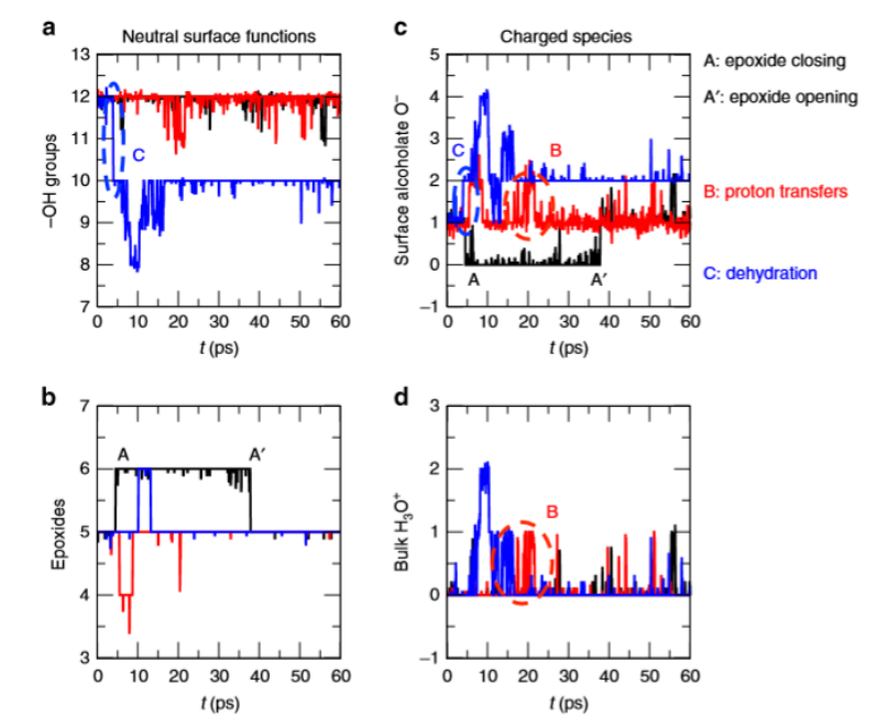 相關(guān)研究成果于2020年由法國高等師范學(xué)院Marie-Laure Bocquet課題組,發(fā)表在Nature Communications(https://doi.org/10.1038/s41467-020-15381-y)上。原文:Structure and chemistry of graphene oxide in liquid water from first principles
