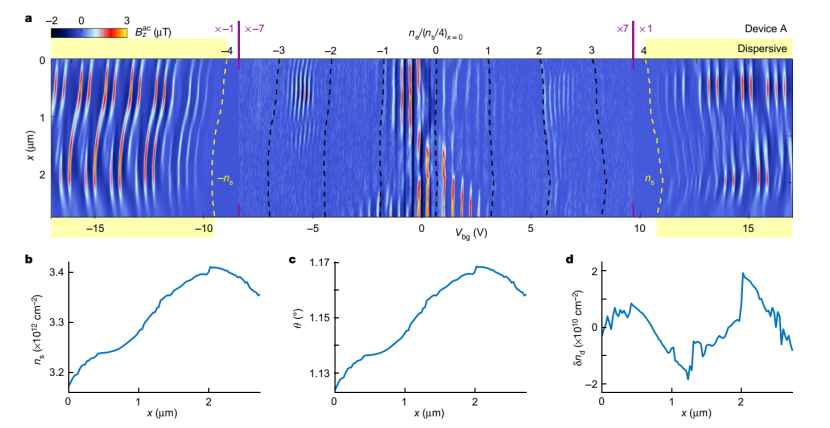 最近發(fā)現(xiàn)在魔角扭曲雙層石墨烯(MATBG)中,扁平電子帶、強(qiáng)相關(guān)性和超導(dǎo)相取決于層間扭曲角θ。雖然控制具有約0.1度的精度已證明,但是關(guān)于局部扭曲角分布的信息很少。在這里,作者使用納米級(jí)針尖掃描超導(dǎo)量子干涉裝置(SQUID-on-tip)獲得處于子霍爾態(tài)的朗道能級(jí)的斷層圖像,并繪制六方氮化硼(hBN) 封裝的MATBG器件的局部變化圖,其相對(duì)精度達(dá)到0.002度,并且空間分辨率為幾個(gè)莫爾周期。研究發(fā)現(xiàn)θ無序程度與MATBG傳輸特性的質(zhì)量之間存在相關(guān)性,并且表明即使是具有相關(guān)狀態(tài)和超導(dǎo)性的最先進(jìn)的設(shè)備,其θ的局部變化也高達(dá)0.1度,具有較大的梯度和跳躍網(wǎng)絡(luò),并且可能包含沒有局部MATBG行為的區(qū)域。同時(shí)MATBG中的相關(guān)狀態(tài)相對(duì)于扭曲角異常特別脆弱,θ的梯度會(huì)產(chǎn)生大的柵極可調(diào)諧的平面內(nèi)電場,即使在金屬區(qū)域也不會(huì)被屏蔽,從而通過形成邊緣通道而改變量子霍爾態(tài),可能會(huì)影響相關(guān)態(tài)和超導(dǎo)態(tài)的相圖。因此,作者確立了扭曲角無序作為一種非傳統(tǒng)類型無序的重要性,從而能確保在結(jié)構(gòu)設(shè)計(jì)中使用扭曲角梯度,用于相關(guān)現(xiàn)象的實(shí)現(xiàn)和門-可調(diào)的內(nèi)置平面電場以應(yīng)用于設(shè)備應(yīng)用程序。