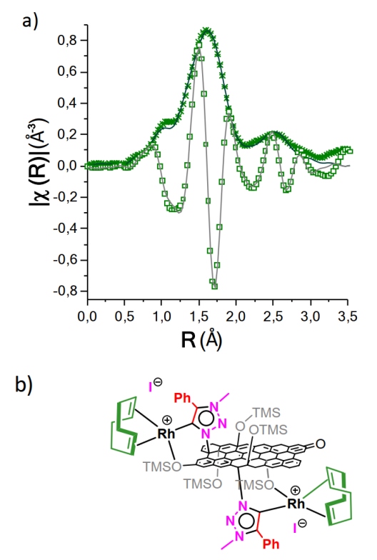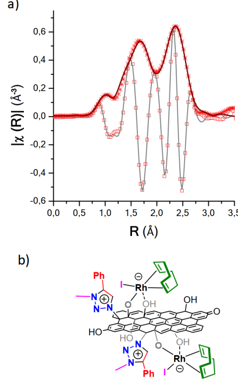 Figure 3. a)對(duì)于TRGO-3-Rh,EXAFS信號(hào)的最佳擬合(線)和實(shí)驗(yàn)(點(diǎn))FTs曲線(星號(hào)為模數(shù),正方形為實(shí)部)。b)根據(jù)EXAFS分析的TRGO-3-Rh結(jié)構(gòu)。