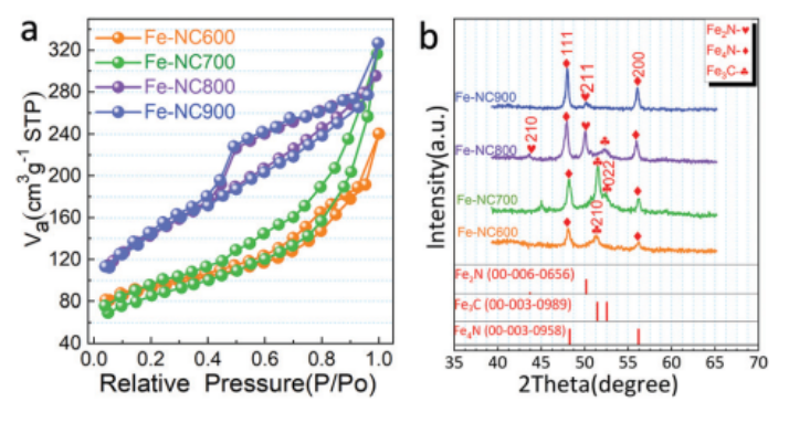 Figure 3. (a)N2吸脫附等溫曲線,表明了孔徑大小情況,(b)XRD圖比較,在不同溫度煅燒后,有多種不同的物相產生。