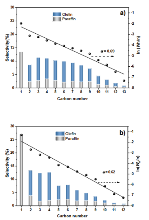 Figure 5. (a) FeK/SWNTs 和 (b) FeK/MWNTs催化劑在CO2加氫反應(yīng)中的碳氫化合物產(chǎn)物分布。