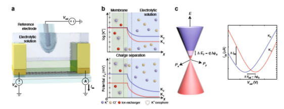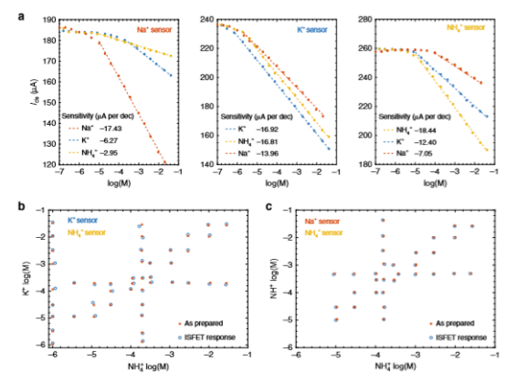 利用現(xiàn)有的色譜,分光光度法和電位計技術(shù),實現(xiàn)實時,高分辨率,同時測量多種離子種類仍具有挑戰(zhàn)性。電位離子傳感器在分辨率和選擇性上都表現(xiàn)出局限性。在此,我們開發(fā)了晶圓級石墨烯晶體管技術(shù)來克服這些限制。大面積石墨烯是制作高分辨率離子敏感場效應(yīng)晶體管(ISFETs)的理想材料,與傳統(tǒng)半導(dǎo)體相比,它可以更方便地制作。我們將ISFET開發(fā)成一個陣列,并應(yīng)用Nikolskii–Eisenman分析法來解決交叉敏感性問題,從而實現(xiàn)高選擇性。通過實驗證明可以用分辨率為2*10