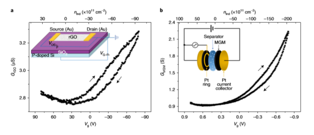 Fig. 2 單層rGO的常規(guī)背柵與多層rGO膜的電解質(zhì)柵的比較。