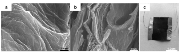 Figure 2 (a) GOA表面的SEM圖, (b) GOA層狀結(jié)構(gòu)的SEM圖和(c)圖片。