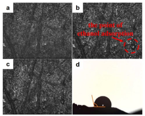 Figure 3 (a) GOA的OM圖,(b)乙醇滴積的OM圖,(c)乙醇解吸的OM圖,(d) GOA樣品的水接觸角。