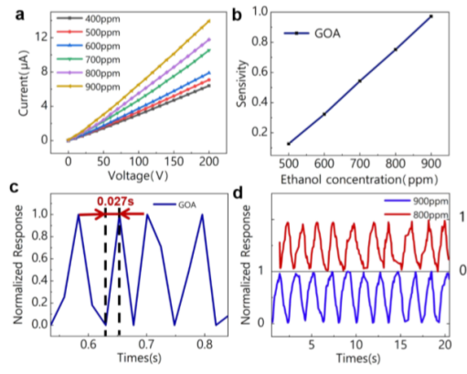 Figure 4 (a) GOA的I-V特征曲線,(b) GOA的乙醇依賴性,(c)乙醇濃度為700ppm時,GOA的響應(yīng)時間,(d)乙醇濃度為800ppm和900ppm時,GOA的歸一化響應(yīng)。