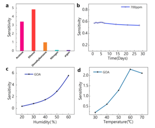 Figure 5 (a) GOA在高乙醇濃度環(huán)境中對不同氣體的選擇性,(b) GOA樣品在乙醇上的長期穩(wěn)定性,(c)乙醇濃度為600ppm時,GOA靈敏度與濕度的關(guān)系和(d)乙醇濃度為500ppm時,GOA靈敏度與溫度的關(guān)系。
