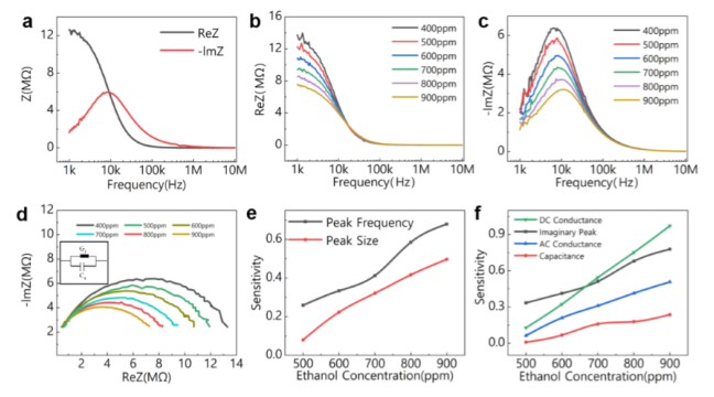 Figure 6 (a)無乙醇環(huán)境下阻抗實(shí)部和虛部與頻率的關(guān)系,(b)不同乙醇濃度下阻抗實(shí)部與頻率的關(guān)系,(c)不同乙醇濃度下阻抗虛部與頻率的關(guān)系,(d)阻抗譜,(e)乙醇濃度與峰頻率和峰大小的關(guān)系,(f)直流電導(dǎo)、交流電導(dǎo)、電容和虛部峰的靈敏度比較。