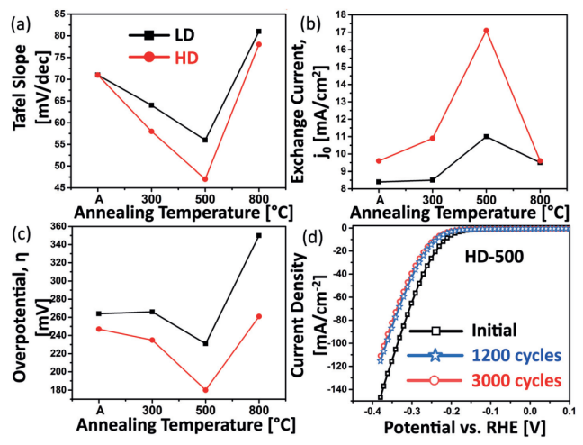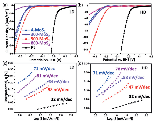 Figure 3. 氫氣析出反應(HER)測量:(a)LD和(b)HD樣品的極化曲線(硫化溫度不斷變化)。(c)和(d)根據(a)和(b)計算出的Tafel斜率。