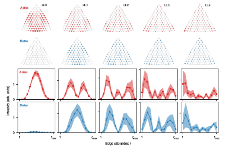 在變形蜂窩狀網(wǎng)格中,通過(guò)使用排列的耦合微波諧振器陣列,我們實(shí)驗(yàn)觀察到了整個(gè)分頻過(guò)程中偽朗道能級(jí)從消失到大偽磁場(chǎng)強(qiáng)度的形成。通過(guò)利用所有場(chǎng)強(qiáng)中,與偽朗道水平兼容的幾何形狀中的自適應(yīng)設(shè)置,可以實(shí)現(xiàn)此結(jié)果。所采用的方法使我們能夠在光譜上觀察到完整形成的“平帶”偽朗道能級(jí),成為狀態(tài)光子密度中的尖峰,并在空間上對(duì)相關(guān)的波函數(shù)進(jìn)行成像,在此我們?yōu)樘卣餍越Y(jié)點(diǎn)結(jié)構(gòu)提供了清晰的證據(jù),反映了基礎(chǔ)低能理論中以前難以捉摸的超對(duì)稱(chēng)性。特別地,我們解決了異常第0個(gè)偽朗道層的全子晶格極化,這揭示了在無(wú)應(yīng)變情況下與之字形邊緣狀態(tài)的深層聯(lián)系。