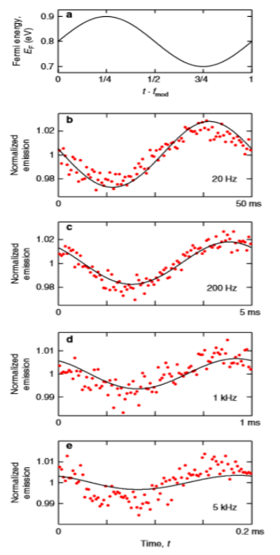 將單光子發(fā)射器的量子光學(xué)特性與納米光子和等離子體系統(tǒng)中強(qiáng)大的近場相互作用相結(jié)合,是創(chuàng)建量子操作和計(jì)量功能的有效方法。在這方面,主動和動態(tài)調(diào)節(jié)發(fā)射器-環(huán)境相互作用的能力特別重要。雖然熱調(diào)制、機(jī)械調(diào)制和光調(diào)制已相繼被證明,但電氣調(diào)制仍然是一個(gè)突出的挑戰(zhàn)。在此,我們通過原位調(diào)整石墨烯的費(fèi)米能量,實(shí)現(xiàn)了快速、全電調(diào)制鉺發(fā)射體納米層與石墨烯之間的近場相互作用。我們展示了強(qiáng)大的相互作用,對于約25%的發(fā)射器,衰減率提高了1000倍以上,并以高達(dá)300 kHz的頻率對這些相互作用進(jìn)行了電調(diào)制,比發(fā)射器的輻射衰減(約100 Hz)快幾個(gè)數(shù)量級。這為集成量子技術(shù)提供了一個(gè)有利的平臺,為通過控制波形的集體等離子體發(fā)射或光子發(fā)射來產(chǎn)生量子糾纏開辟了途徑。