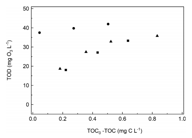 Figure 3. 草酸催化臭氧化過(guò)程中,TOC消除后TOD的變化。GO/TiO