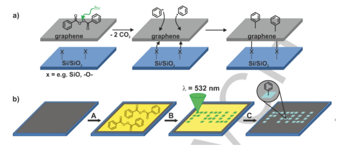 Scheme 1. (a)激光誘導石墨烯與DBPO功能化的機制。(b)通過空間控制的DBPO解理石墨烯在Si/SiO