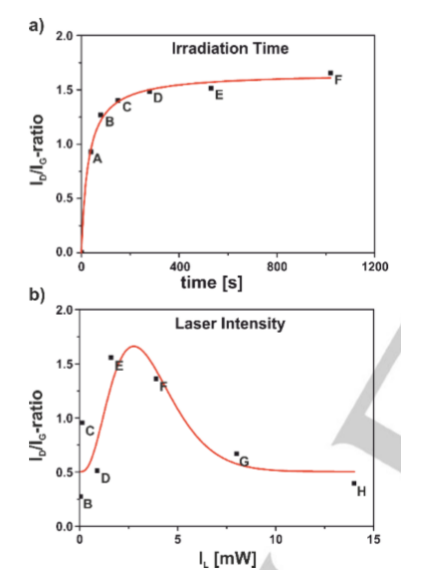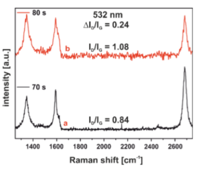 Figure 3. a)時間照射研究從30秒到16分鐘不等的ID/IG比值的演變; b)激光功率為0.017 mW到14 mW的激光強度。