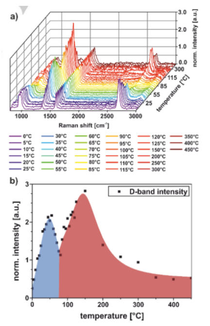 Figure 4. a)涂有DBPO的單層石墨烯隨溫度變化的拉曼測量。b)功能化(藍色區(qū)域)和去功能化(紅色區(qū)域)時d波段強度變化曲線圖。