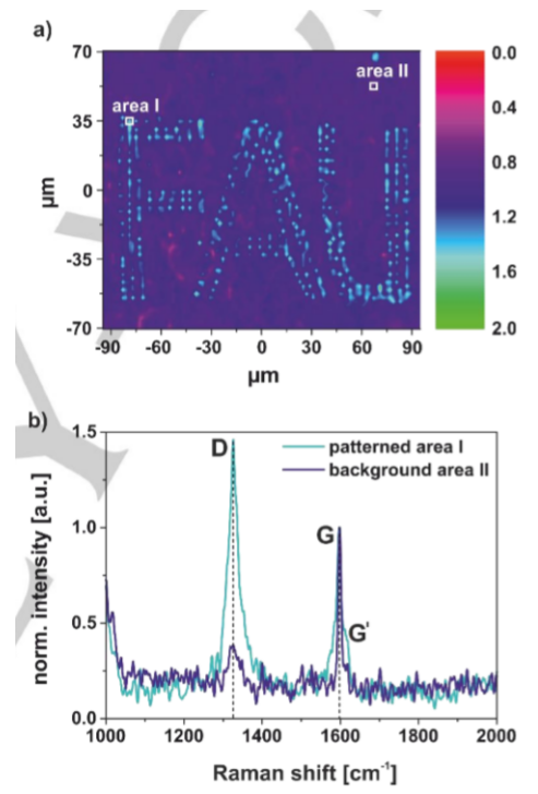 Figure 5. a)用強度為1.6 mW(集成時間為8 s)的633 nm激光在186×144 um區(qū)域獲得6912個測點的拉曼圖。b)通過拉曼圖獲得,在G波段上歸一化的圖案化區(qū)域I和背景區(qū)域II的拉曼點光譜。