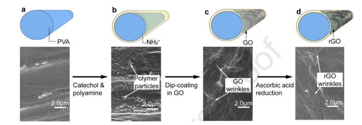 Figure 1. GO和rGO涂敷PVA纖維的過程示意圖:(a)原始PVA纖維,(b)鄰苯二酚和多胺改性的PVA纖維,(c)GO涂敷的PVA纖維和(d)rGO涂敷的PVA纖維。