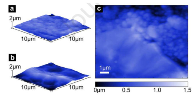 Figure 2.(a)鄰苯二酚和多胺改性PVA纖維的表面粗糙度根光纖,(b)GO@PVA,以及(c)GO涂敷和非涂敷區(qū)域之間邊界的原子力顯微鏡測量的表面粗糙度。