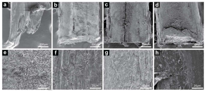 Figure 3. (a)PVA,(b)GO@PVA,(c)rGO1@PVA和(d)rGO2@PVA的拉出纖維末端的表面形態(tài)。(e)PVA,(f)GO@PVA,(g)rGO1@PVA和(h)rGO2@PVA 拔出后中部的SEM圖像。