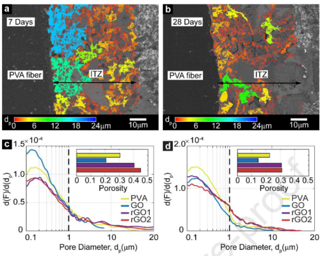 Figure 4. PVA/水泥經(jīng)過(a)7天和(b)28天固化后的ITZ的BSE圖像。5個樣品經(jīng)(c)7天和(d)28天固化后的孔徑尺寸分布情況。