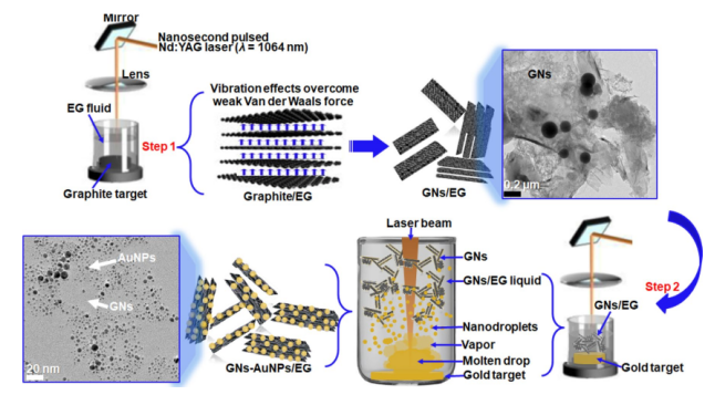 Figure 1. 脈沖Nd:YAG激光燒蝕分別在EG和GNs/EG介質(zhì)中的石墨和Au標(biāo)靶合成GNs-Au NPs/EG雜化納米流體的示意圖。