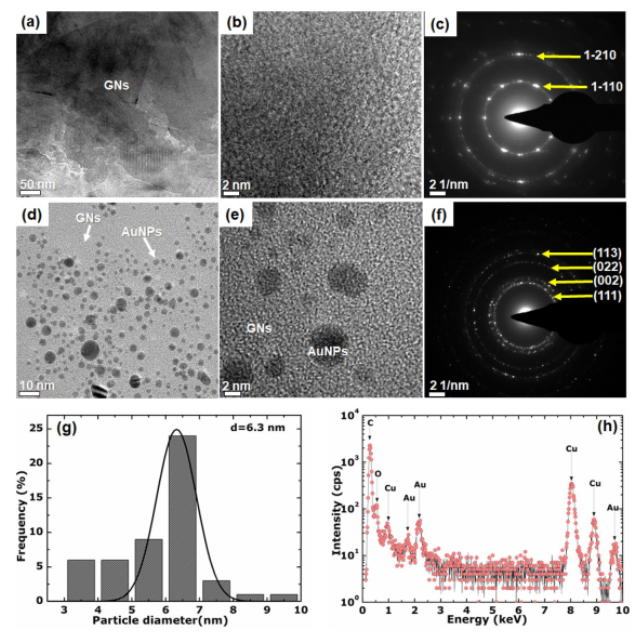Figure 2. (a,b)GNs/EG納米流體和GNs的低倍/高倍TEM圖,以及相應(yīng)的(c)SAED圖。(d,e)GNs-Ag NPs/EG雜化納米流體的低倍/高倍TEM圖,以及相應(yīng)的(f)SAED圖。(g)Ag NPs的尺寸分布情況(高斯分布曲線)。(h)GNs-Au NPs/EG雜化納米流體的EDX能譜。