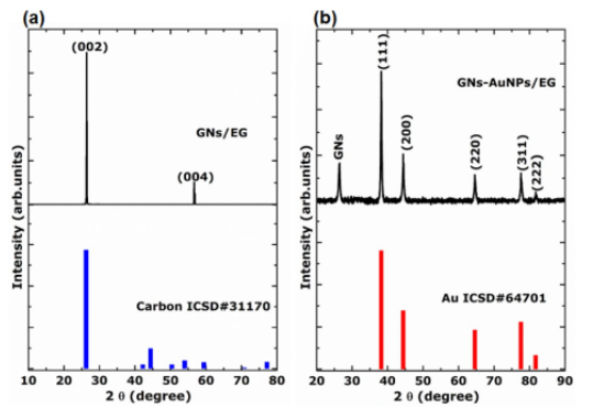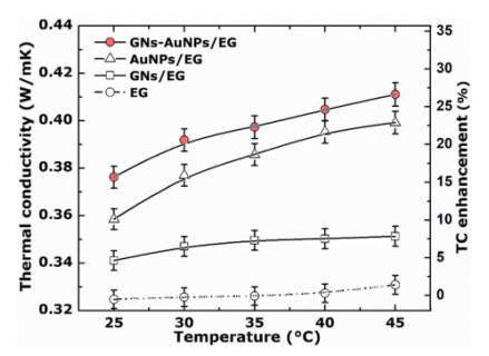 這里,報(bào)道了金納米顆粒(Au NPs)修飾石墨烯納米片(GNs)基納米流體的合成及導(dǎo)熱性質(zhì)。其具體合成過程是通過納秒脈沖Nd:YAG激光(波長(zhǎng)= 1,064 nm)燒蝕在乙二醇(EG)基礎(chǔ)液中的石墨靶,隨后金靶,以獲得GNs-AuNPs/EG雜化納米流體。通過一系列表征發(fā)現(xiàn),結(jié)晶的Au NPs修飾片狀的GNs,其平均粒徑為6.3 nm。在25–45°C溫度范圍內(nèi)的熱導(dǎo)率分析表明, GNs-AuNPs/EG雜化納米流體的導(dǎo)熱系數(shù)為0.41 W/mK,高于GNs/EG(0.35 W/mK),Au NPs/EG(0.39 W/mK)納米流體,以及EG基礎(chǔ)液(0.33 W/mK)。其導(dǎo)熱性能的提高可歸因于Au NPs和石墨烯片之間的協(xié)同效應(yīng)。所合成的GNs-AgNPs/EG雜化納米流體有望應(yīng)用于熱量轉(zhuǎn)移技術(shù)領(lǐng)域。此外,這項(xiàng)工作還提出了一種制備石墨烯-金屬納米復(fù)合材料的綠色合成方法。
