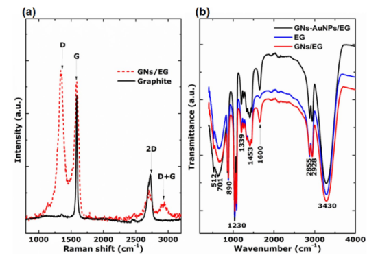 Figure 4. (a)拉曼光譜。(b)GNs-AuNPs/EG和GNs/EG納米流體以及EG基礎(chǔ)液的FTIR光譜。