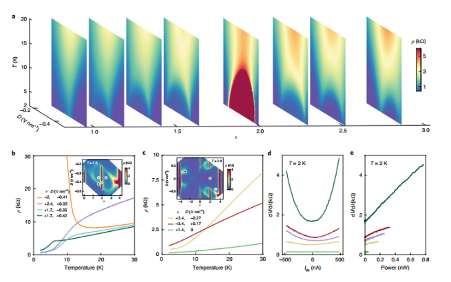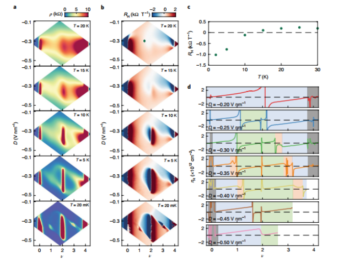 Figure 1. 1.30° tDBG裝置中可調(diào)的能帶結(jié)構(gòu)和傳輸特性。(a)tDBG裝置封裝在六邊形氮化硼(BN)和石墨柵極里的原理示意圖,(b)tDBG裝置的電阻率,(c)計(jì)算的能帶結(jié)構(gòu),(d)計(jì)算的態(tài)密度(DOS),(e)能帶隙,(f-g)電阻率和霍爾系數(shù)。