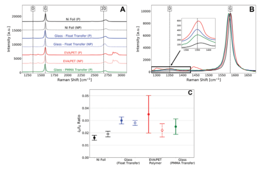 Figure 4. A)所有樣品的Raman光譜,B)只有P側(cè)石墨烯樣品的Raman光譜,C)多層石墨烯薄膜的平均I