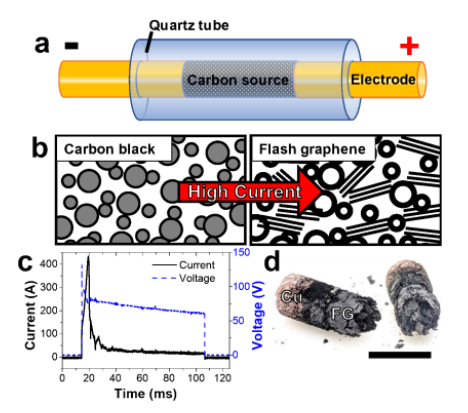 Figure 1. 普通FJH特征。(a)碳源形成FG的FJH裝置示意圖,(b)FJH之后碳源石墨化示意圖,(c)電流隨時間的變化情況,(d)FJH之后FG的光學照片。