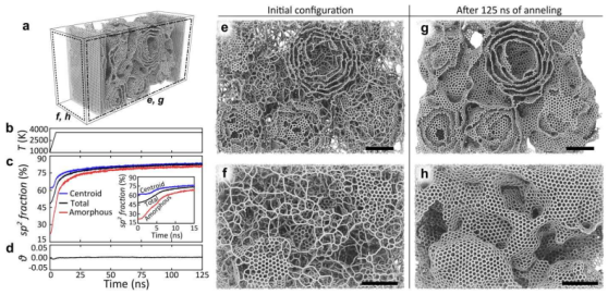 Figure 3. 模擬閃蒸石墨烯的形成。(a)無定形碳結(jié)構(gòu)用于高溫熱處理分子動力學模擬,熱處理期間(b)溫度情況,(c)石墨化程度,(d)赫爾曼的取向函數(shù),(e-f)不同位置的直觀比較,(g-h)最終結(jié)構(gòu)。