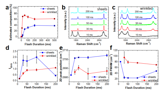 Figure 4. 閃蒸時間對石墨烯形貌的影響。(a)組分百分數(shù)與閃蒸時間的函數(shù)關(guān)系,(b-c)Raman光譜,Raman分析:(d)2D/G強度比例,(e)2D峰位置,(f)2D FWHM。