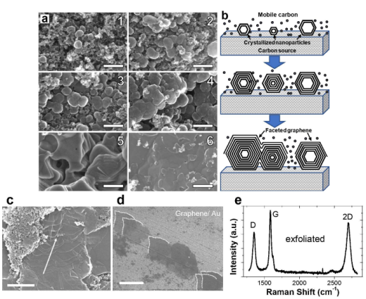 Figure 5. 石墨烯生長過程表征。(a)石墨晶體的成核和生長過程,(b)可能的生長機制,(c-d)SEM圖,(e)剝離的FG的典型Raman光譜。