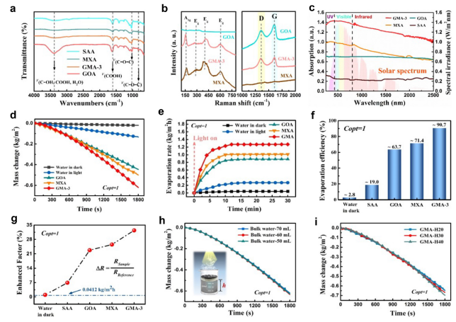 x(MXene)巧妙地組裝成3D多孔宏觀氣凝膠整體,作為獨立的太陽能驅(qū)動界面蒸發(fā)器,以實現(xiàn)高效、全面的水凈化。在此過程中,MXene將GO還原為還原氧化石墨烯(RGO),從而實現(xiàn)了自增強的光熱轉(zhuǎn)化調(diào)節(jié)?;诟覩O/MXene氣凝膠(GMA)的蒸發(fā)器在一次陽光照射下實現(xiàn)了高達90.7%的高太陽蒸發(fā)效率,蒸發(fā)速率為1.27 kg/m