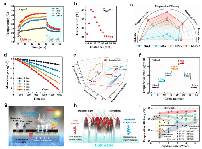 Figure 3. (a)在1 sun下,表面溫度隨時間變化。(b)GMA-3的溫度分布,在1 sun下側(cè)面的距離,GMA-3表面定義為0毫米。(c)比較太陽能驅(qū)動的界面蒸發(fā)性能;在不同光強度下,GMA-3(d)水的質(zhì)量變化和(e)穩(wěn)定蒸發(fā)效率、蒸發(fā)速率和表面溫度。(f)GMA-3循環(huán)太陽能驅(qū)動的界面蒸發(fā)性能。(g)GMA-3在太陽驅(qū)動的界面蒸發(fā)過程中的能量平衡和傳熱圖。(h)GMA-3系統(tǒng)中的光和熱管理以及水傳輸?shù)牟鍒D。(i)GMA-3太陽驅(qū)動的界面蒸發(fā)性能與在不同太陽光照強度下與先前工作的比較。