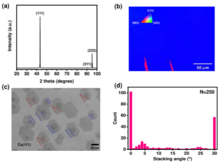 根據(jù)兩層石墨烯之間的疊加角度,雙層石墨烯(BLG)表現(xiàn)出獨(dú)特的性能。盡管可以通過(guò)化學(xué)氣相沉積(CVD)獲得具有0°和30°的堆疊角度的BLG,Cu表面對(duì)確定疊加角的影響尚不清楚,而通過(guò)這種影響可以進(jìn)一步精細(xì)地控制疊加角。在這里,我們報(bào)道的Cu催化劑的晶面在選擇BLG的堆疊角度中起關(guān)鍵作用,并提供實(shí)驗(yàn)和計(jì)算證據(jù),表明原子平坦的Cu(111)表面產(chǎn)生的堆疊角為0°和30°,而原子階梯狀Cu (311)和Cu (110)表面則產(chǎn)生較小堆疊角,其BLGs為3–5°,是CVD的主要產(chǎn)品。