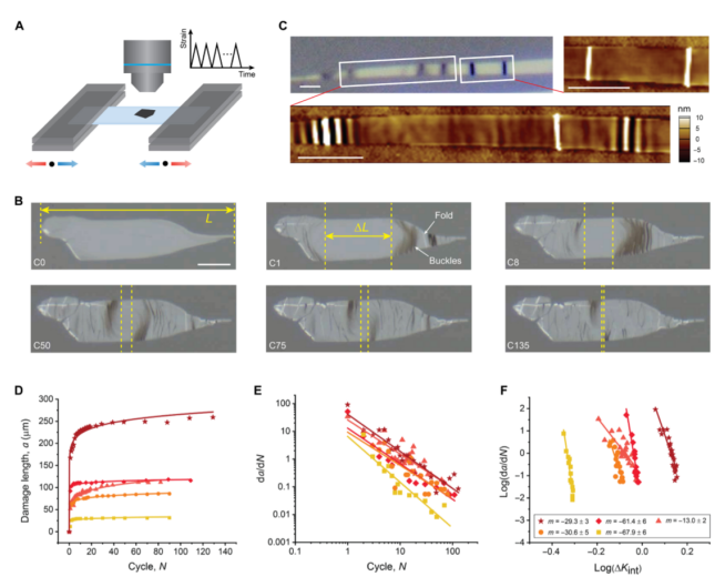 石墨烯通常通過弱范德華(vdW)相互作用與其他材料接觸。特別令人感興趣的是石墨烯-聚合物界面,該界面在包括柔性電子產(chǎn)品和多功能涂料在內(nèi)的各種應(yīng)用中不斷受到動態(tài)負(fù)載的影響。通過原位循環(huán)載荷,我們直接觀察到了石墨烯-聚合物界面的界面疲勞擴(kuò)展,發(fā)現(xiàn)該界面滿足修正的Paris定律。此外,通過結(jié)合平面內(nèi)剪切和平面外撕裂機制,通過vdW接觸產(chǎn)生的周期性載荷甚至能夠?qū)е略际┑钠跀嗔?。剪切斷裂主要發(fā)生在循環(huán)載荷引起的褶皺連接處,并平行于載荷方向傳播。進(jìn)行斷裂力學(xué)分析,發(fā)現(xiàn)了循環(huán)加載過程中石墨烯異乎尋常的自撕裂行為動力學(xué)。這項工作為石墨烯和石墨烯-聚合物界面的動態(tài)可靠性提供了機械上的見解,這將有助于石墨烯基結(jié)構(gòu)的持久設(shè)計。