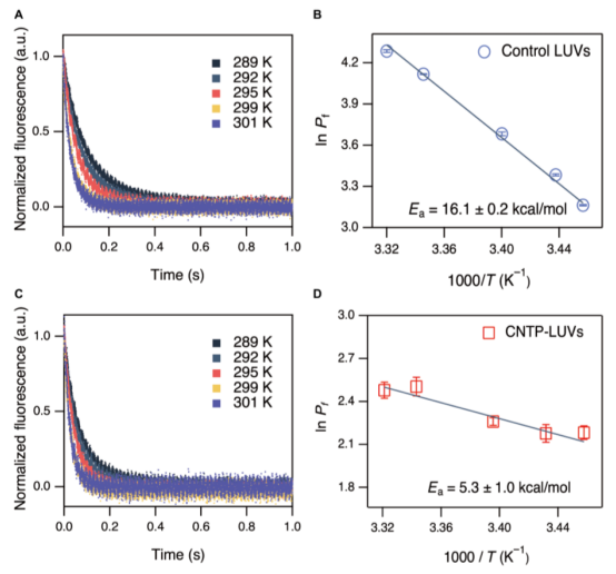 碳納米管(CNT)孔模仿水通道的結(jié)構(gòu),可支持極高的水傳輸速率,使其成為構(gòu)建人造水通道和高性能膜的有力候選者。在優(yōu)化的實(shí)驗(yàn)條件下,我們測(cè)量了直徑為0.8 nm的CNT孔蛋白(CNTP)(嵌入脂質(zhì)膜中的短CNT片段)來(lái)測(cè)量水和離子的滲透率。通過(guò)CNTPs測(cè)得的水傳輸活化能與典型的單排水傳輸阻隔值一致。在CNTPs中,對(duì)水傳輸進(jìn)行適當(dāng)?shù)脑獎(jiǎng)恿W(xué)模擬也報(bào)告了相似的活化能值,并提供了水進(jìn)入這些通道的分子尺度機(jī)制的細(xì)節(jié)。CNTPs強(qiáng)烈排斥氯離子,并顯示出與商業(yè)脫鹽膜相當(dāng)?shù)乃}滲透選擇性值。