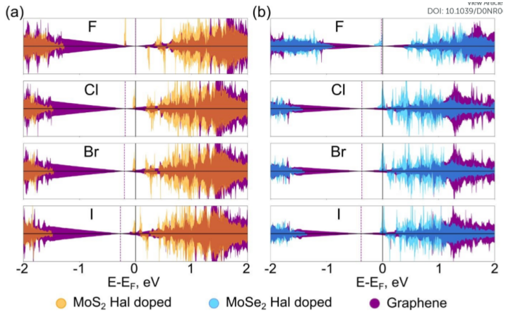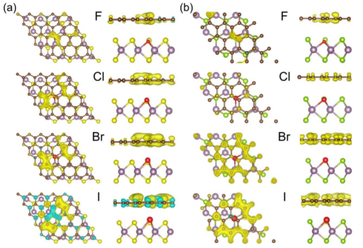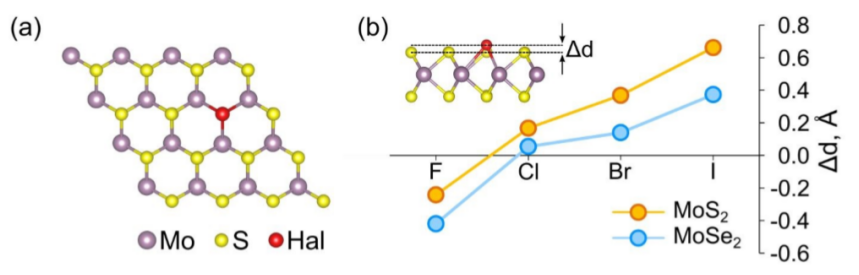 (X = S,Se)單層,通過鄰近效應可影響石墨烯的電子結(jié)構(gòu)。借助最新的計算可以觀察到此過程。發(fā)現(xiàn)鹵素 (F, Cl, Br, I)取代一個硫原子會導致MoX