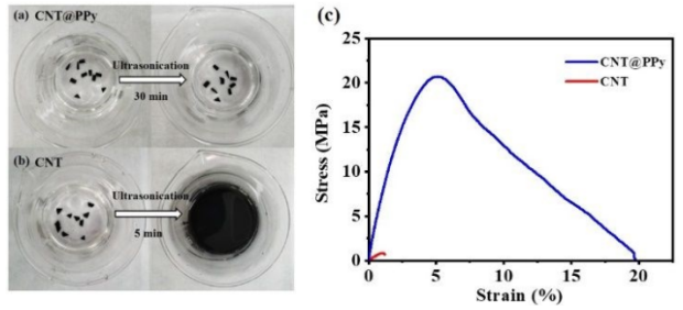 Figure 3.(a)超聲處理30分鐘前后CNT@PPy-100膜的差異。(b)超聲處理5分鐘前后CNT膜的差異。(c)純CNT和堅固的CNT @ PPy-100膜的典型應(yīng)力-應(yīng)變曲線。