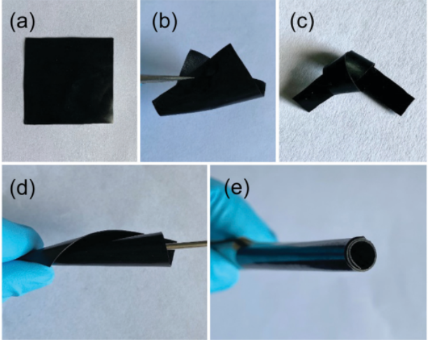 Figure 3. (a)方形且表面光滑(h-BNNS30/CNT70)65/TPU35復(fù)合膜的光學(xué)照片,(b–e)(h-BNNS30/CNT70)65/TPU35復(fù)合膜在折疊,打結(jié),卷曲和卷起狀態(tài)時的照片。