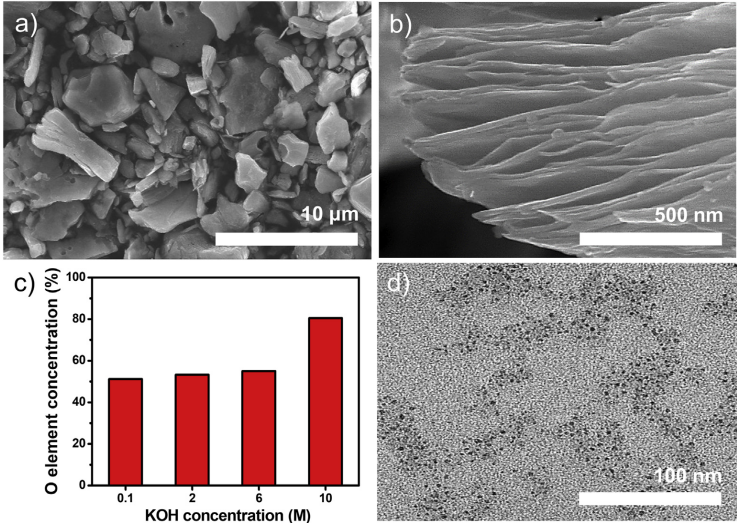 Figure 2.(a)MAX、(b)MXene的場發(fā)射掃描電子顯微鏡(FE-SEM)圖像,(c)在MXene激活期間根據(jù)KOH的不同濃度變化的O元素濃度;(d)GQDs/TiO