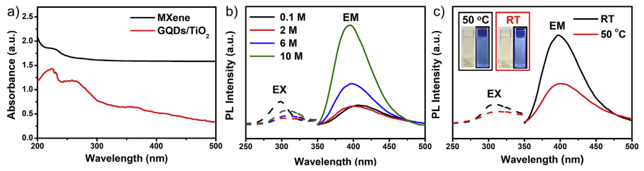 碳化物衍生的石墨烯量子點(GQDs)具有無毒、強大的集光能力和較大的表面積,因此在光致發(fā)光領(lǐng)域具有很高的潛力。為了經(jīng)濟有效且穩(wěn)定地生產(chǎn)GQDs,降低GQDs的合成溫度是一個很好的選擇,但仍然是一個很大的挑戰(zhàn)。在此,通過在室溫下控制MXene的KOH(水溶液)的反應(yīng)時間和濃度,獲得光致發(fā)光GQDs。這種簡便且經(jīng)濟高效的方法可以生產(chǎn)GQDs/TiO